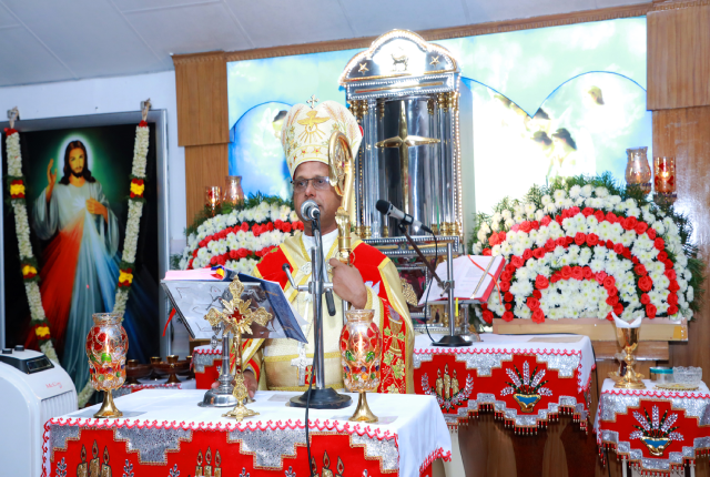Garlanding the Divine Mercy Picture on every fridays started at the request of Holy Mother and has now became a popular piety in the Shrine. People offer this flower garland as a token of thanks giving for favors received and to receive blessings. Cooked sweet rice offering (Pachor Nercha) is distributed after Divine Mercy Novena on Fridays and on the two feast days of the Shrine. This piety is also continued as a thanks giving practice and for receiving blessings.