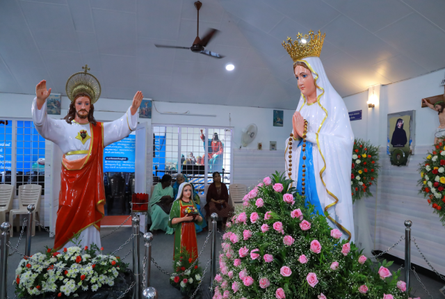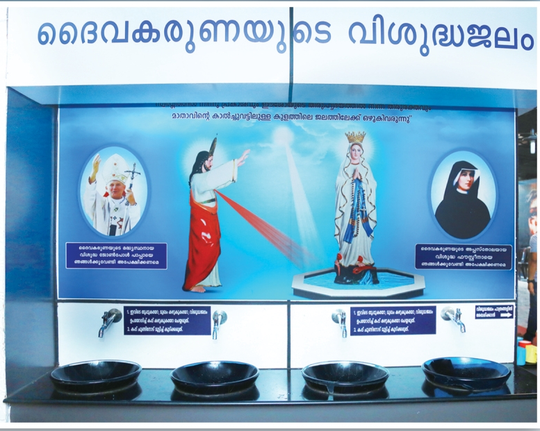 The pond at the feet of Mother of Divine Mercy was built according to the specific instruction of Holy Mother with the intention of storing water for drinking and bathing, for those visiting Shrine. The water in the pond was allowed to be used by those visiting the Shrine, after it has been kept in the pond for one hour after filling. Chippy was shown the vision of Heavenly light illuminating the water in the pond and Precious Blood from the hands of Jesus Christ following into it. Holy Mother revealed to the family of Chippy that sprinkling the holy water in houses and institutions will give a divine protection and many people receive this blessing by sprinkling the holy water. This channel of Divine Mercy of using the holy water for drinking and bathing is opened up with the aim of ensuring physical, mental and spiritual healings for those who have been sailing through troubled waters with different types of sufferings of life without any relief. People with many obstacles in life, have witnessed miraculous involvment of Mother of Divine Mercy, when trusting and praying in Divine Mercy Shrine.