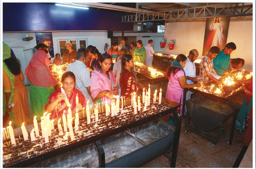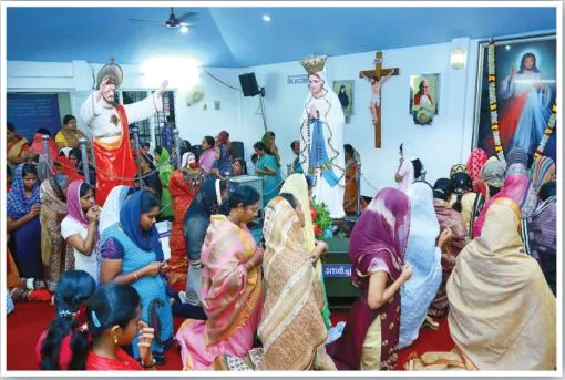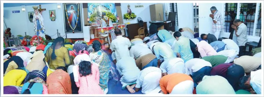 Lighting candles is one of the most important piety practiced in the Shrine. This is done mainly for surrendering the family members - living and dead - into the Divine Heart of Jesus, the Ocean of Mercy, by the merits of the atonement made by Jesus Christ for the sins of the world, in His Passion Death and Resurrection and through the mediation of the Mother of Divine Mercy. Similarly this dedication to Divine Mercy by lighting candles can be done for other needs and for matters which needs divine protection like house, household things, vehicles, jobs, land and other properties, travel and also for sickness and tribulations of life. Lighting candles in the Shrine is not just an offering to God but a prayer of entrustment of our needs and persons that intends to be dedicated to the Divine Mercy. Holy Mother said that needs entrusted and persons surrendered to Divine Mercy by lighting candles in the Shrine are accepted before the Father in Heaven. She has promised that those who visit the Shrine and pray trusting in Divine Mercy will be wrapped up in the veil of the Mercy of God. As the prayers person living in sin are not received before the Throne of God, a repentant Sacramental Confession has to be made before praying for the needs and putting petitions in the Shrine by lighting candles. This Shrine is not just a Church with the presence of the Trinitarian God in the Eucharist, but a place where the Glory of Divine Mercy and the continued intercession of Mother Divine Mercy are promised. So those who visit the Shrine are asked to bring up their pains and sufferings and their needs before the Mother of Divine Mercy, as if they are talking to another person. Spending time in silent prayer in the Shrine is a common practice for physical, mental and spiritual healing and for getting release from diabolic bondages. The healings received from multitude of illnesses and mental agonies along with the spiritual conversions taking place in the Shrine are strong witnesses of the active intervention of Holy Mother in the Shrine. Wearing the Rosaries put on the hands of Mother of Divine Mercy Holy Mother allowed visitors in the Grotto from 2003 onwards, even before the grotto was handed over to the Eparchy of Kothamangalam in 2006. In preparation for allowing the visitors to the Grotto, Chippy's family was asked to recite 1000 rosaries and when finished they were asked to get 250 rosaries, which were equivalent to 250 full rosaries recited by the family. These rosaries were put on the folded hands of the statue of Mother of Divine Mercy. Holy Mother then said to Chippy and her family “I have come not for you alone, but for the whole world. From today onwards the Grotto shall be opened for the public". Thus on November 28th 2003 the Grotto was opened up for the public for praying. The rosaries put on the hands of the Holy Mother was then given to the visitors of the Grotto, free of cost to wear on their neck. According to the instruction given by Holy Mother this practice of giving rosaries put on the hands of the statue of the Holy Mother to people visiting the Shrine is continued even now. Many people offer rosaries in the Shrine for favours received. There are very many testimonies about receiving special divine protection, as well as getting deliverence from physical, mental and diabolic torments by wearing this rosaries. This is one of the spiritual channels revealed by Mother of Divine Mercy for receiving Divine Mercy.